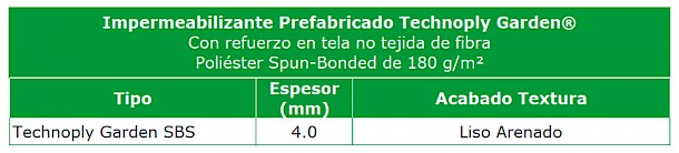 Technoply Garden® es un impermeabilizante prefabricado que permite crear un ambiente ecológico, reduciendo las islas de calor; su formulación resiste el empuje de las raíces, además resiste el peso de los asientos, cargas estáticas, pasos peatonales, etc. sin dañar la vegetación.