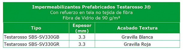 Testarosso J® es una membrana con alta resistencia al envejecimiento, a los hongos y al contacto con el agua. Además, posee propiedades impartidas por el butadieno que confiere flexibilidad y resistencia a los rayos ultravioleta.